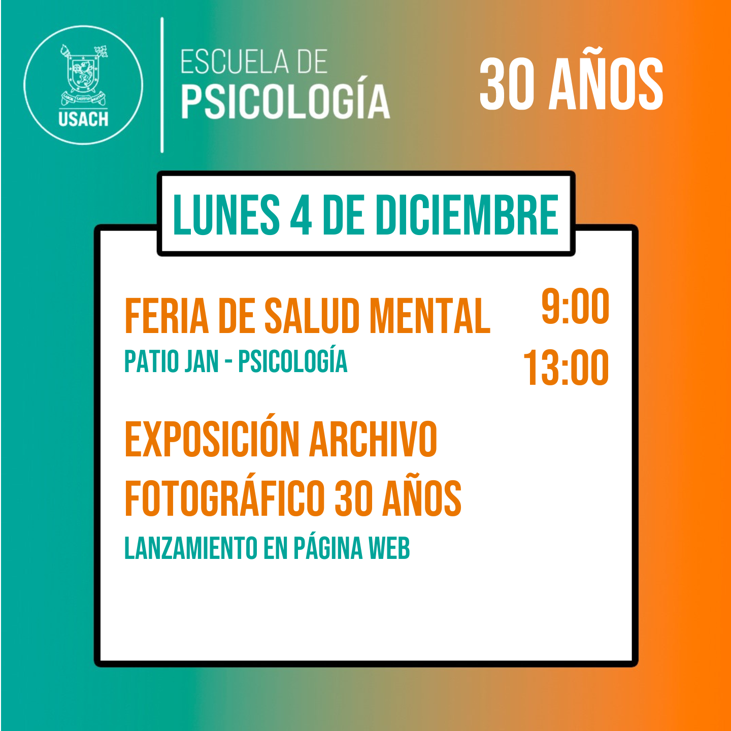 Desde el lunes 4 al jueves 7 de diciembre, celebraremos los 30 años de nuestra Escuela de Psicología.