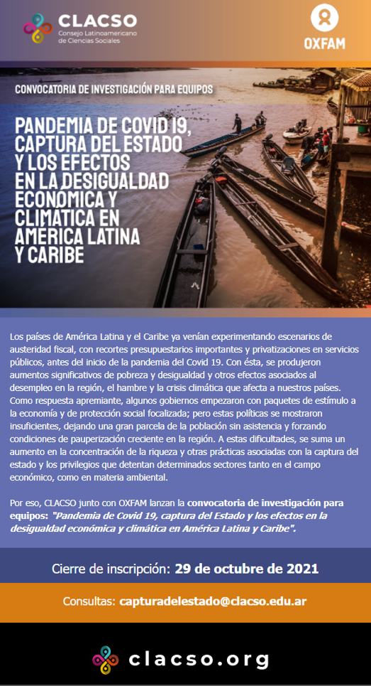 “Pandemia de Covid 19, captura del Estado y los efectos en la desigualdad económica y climática en América Latina y Caribe» es el nombre que lleva el nuevo concurso presentado por el Consejo Latinoamericano de Ciencias Sociales (CLACSO) y la Organización Mundial contra la pobreza Oxfam. La instancia busca recibir propuestas de investigación sobre las consecuencias de las medidas que han tomado los Gobiernos para afrontar la pandemia en materia de justicia económica y justicia climática entre otras.Para conocer los requisitos y normas de la convocatoria pincha aquí.