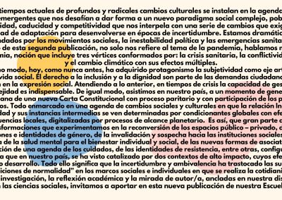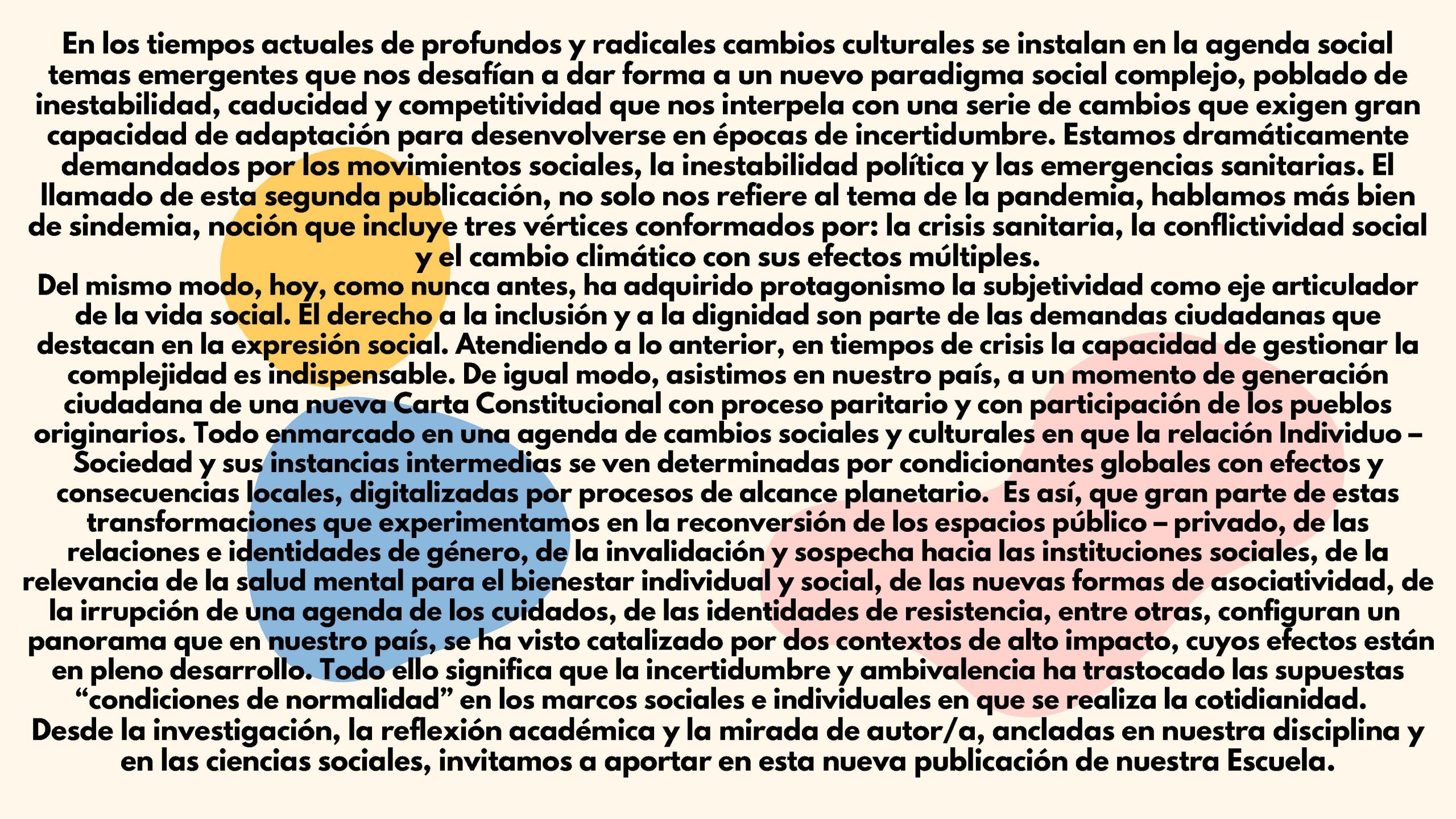 Del mismo modo, hoy, como nunca antes, ha adquirido protagonismo la subjetividad como eje articulador de la vida social. El derecho a la inclusión y a la dignidad son parte de las demandas ciudadanas que destacan en la expresión social. Atendiendo a lo anterior, en tiempos de crisis la capacidad de gestionar la complejidad es indispensable. De igual modo, asistimos en nuestro país, a un momento de generación ciudadana de una nueva Carta Constitucional con proceso paritario y con participación de los pueblos originarios. Todo enmarcado en una agenda de cambios sociales y culturales en que la relación Individuo – Sociedad y sus instancias intermedias se ven determinadas por condicionantes globales con efectos y consecuencias locales, digitalizadas por procesos de alcance planetario. Es así, que gran parte de estas transformaciones que experimentamos en la reconversión de los espacios público – privado, de las relaciones e identidades de género, de la invalidación y sospecha hacia las instituciones sociales, de la relevancia de la salud mental para el bienestar individual y social, de las nuevas formas de asociatividad, de la irrupción de una agenda de los cuidados, de las identidades de resistencia, entre otras, configuran un panorama que en nuestro país, se ha visto catalizado por dos contextos de alto impacto, cuyos efectos están en pleno desarrollo. Todo ello significa que la incertidumbre y ambivalencia ha trastocado las supuestas “condiciones de normalidad” en los marcos sociales e individuales en que se realiza la cotidianidad. Desde la investigación, la reflexión académica y la mirada de autor/a, ancladas en nuestra disciplina y en las ciencias sociales, invitamos a aportar en esta nueva publicación de nuestra Escuela.