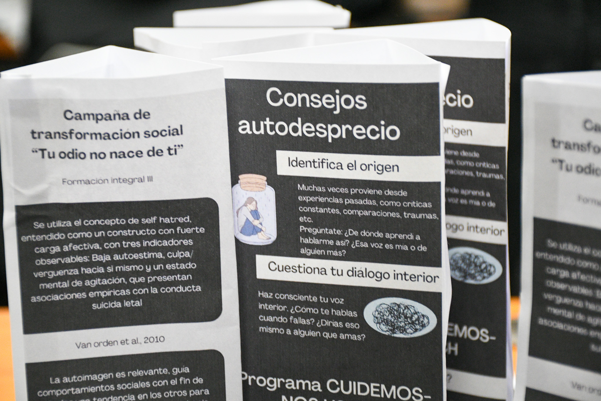 Alejandra Pezoa, parte de la coordinación de Formación Integral, explicó el propósito de la actividad mencionando que “el viernes lo que hicimos (…) es una muestra de las campañas que realizaron cada grupo de las cuatro secciones de Formación Integral 3. Cada grupo eligió una temática para investigarla y una manera de cómo podíamos entregar ese mensaje a las distintas comunidades, pensando que son temáticas psicosociales en las que la psicología está involucrada”.