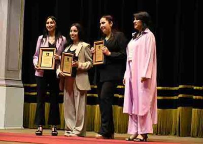 Durante la ceremonia, se entregaron premios a los mejores alumnos, incluyendo a Daniela Alarcón Fuentes, quien compartió su testimonio sobre sus años en la USACH, destacando la adaptación de la universidad a las clases online y superando los desafíos que la pandemia presentó.
